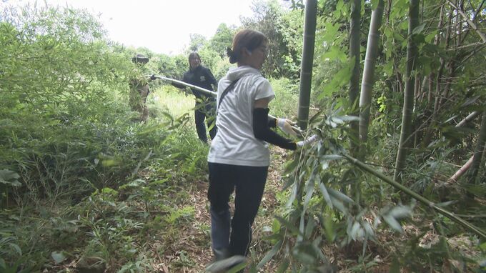 慣れない作業にメンバーたちは声を掛け合って協力しながら伐採を進めていきます。5メートルを超える竹を扱うのは一苦労。