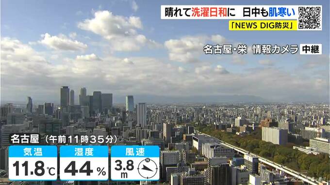 正午前の名古屋市内、雲は出ていますが朝から晴れています。この時間の気温は11.8℃で、日差しの暖かさはあるものの、日陰では肌寒く感じる気温となっています。