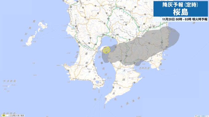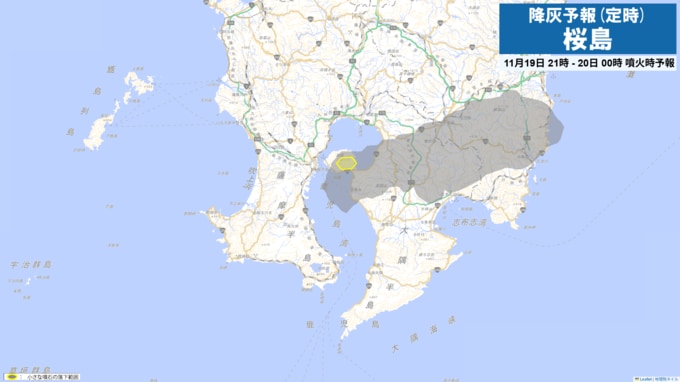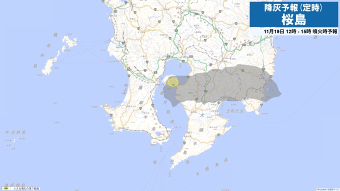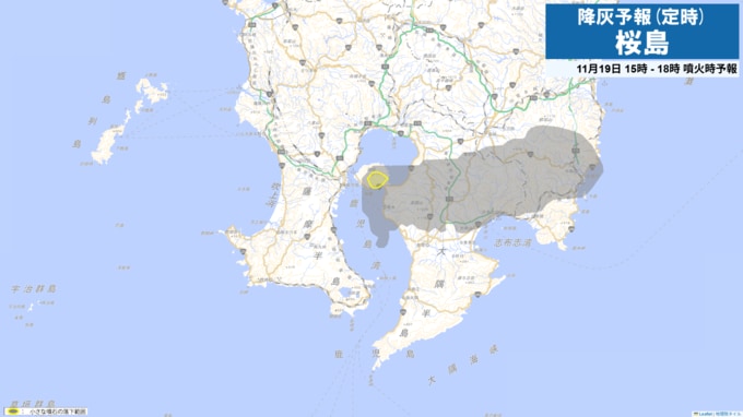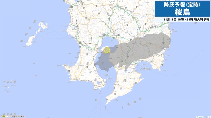 現在、桜島は噴火警戒レベル3(入山規制)です。桜島で噴火が発生した場合には、19日21時から24時までは火口から東方向に降灰が予想されます。