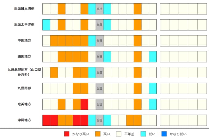 東海地方、西日本と沖縄・奄美の気温は、20日は低い所もありますが、その後は平年並の日が多いでしょう。