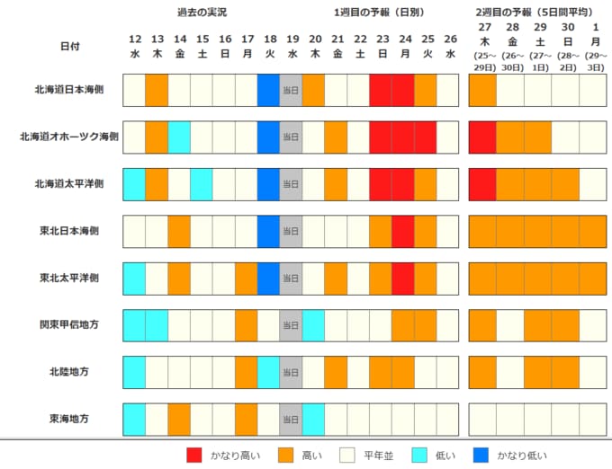 ・2週目の予報は中心の日に前後2日間を加えた5日間の平均(平均気温の5日間平均)です。平均期間は中心の日の下に表示しています。2週目のかなり高い(かなり低い)は、かなり高い(かなり低い)気温となる確率が30%以上のときに表示します。