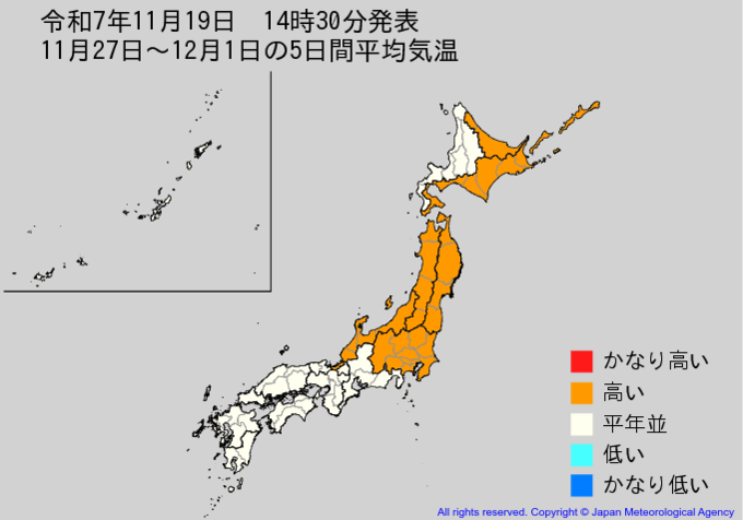 【2週間気温予報】北日本の向こう2週間の気温は平年並か高くかなり高い日も 農作物の管理などに注意 全国の天気を地方ごとに 気象庁 テレビユー山形 2025年11月19日(水) 15:00 国内 ■11月27日~12月1日の5日間平均気温 ・8日先から12日先まで5日間平均した日平均気温を表示しています。 ・かなり高い(かなり低い)は、かなり高い(かなり低い)気温となる確率が30%以上のときに表示します。