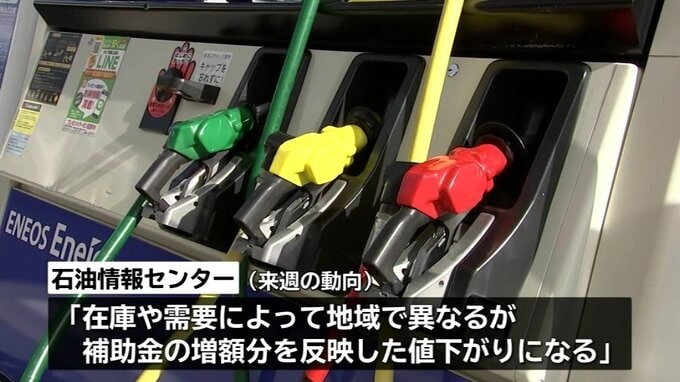 石油情報センターは来週の動向について、ガソリンの暫定税率廃止に向けて13日に政府の補助金が5円引き上げられたことから、「在庫や需要によって地域で異なるが、補助金の増額分を反映した値下がりになる」と分析しています。