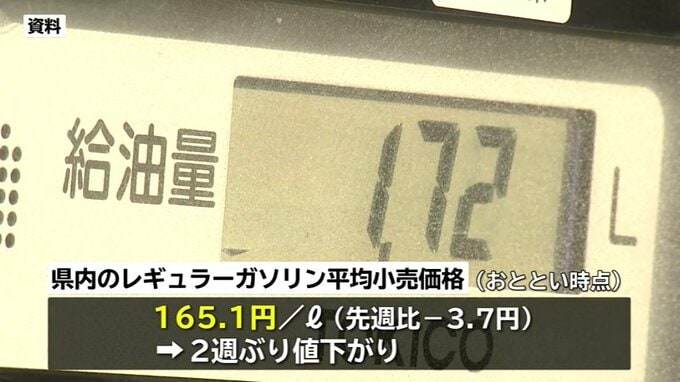 石油情報センターによりますと、17日時点の県内のレギュラーガソリンの平均小売価格は、先週に比べて3.7円安い1リットルあたり165.1円でした。