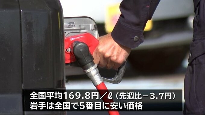 全国平均も先週より3.7円値下がりし169.8円で、都道府県別で岩手は埼玉、宮城などに続いて5番目に安い価格でした。