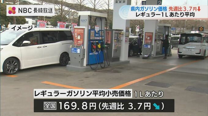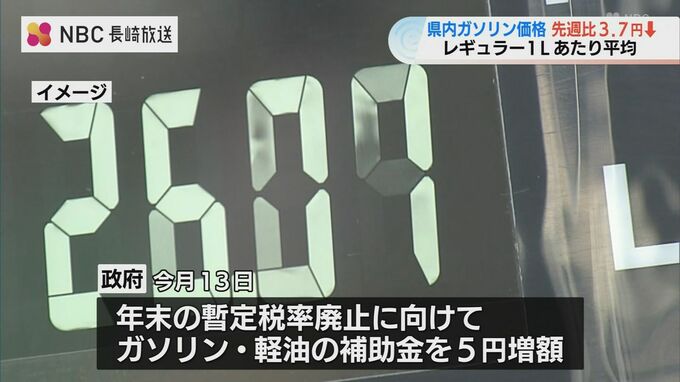 ガソリンの暫定税率廃止に向けた政府の補助金引き上げを受けて、長崎県内のレギュラーガソリン1リットルあたりの平均小売価格は先週より3.7円値下がりしました。