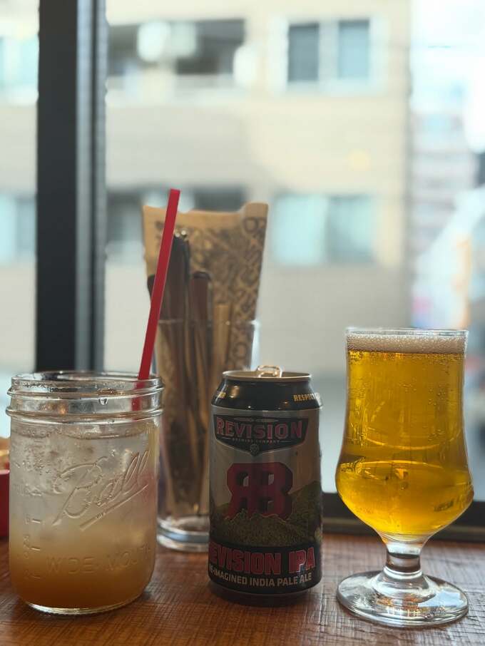 店内の雰囲気も写真から伝わり、木製のカウンターと暖色系の照明が特徴的な落ち着いた空間となっており、窓から差し込む自然光が心地よい様子です。テーブルには、黄金色に揚げられたポテトや「REVISION IPA」のクラフトビールも並んでいました。