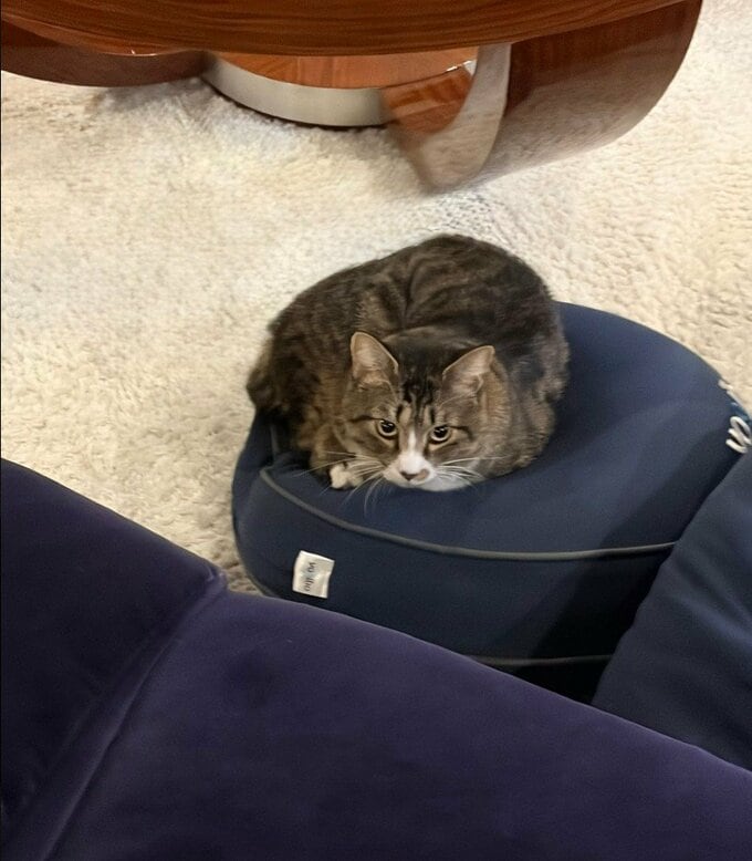 藤さんが投稿した写真では、8月に保護したキジ猫の「じゃこ天」が、濃紺の使い込まれた丸いクッションの上にうずくまって、上目遣いにこちらをにらんでいます。