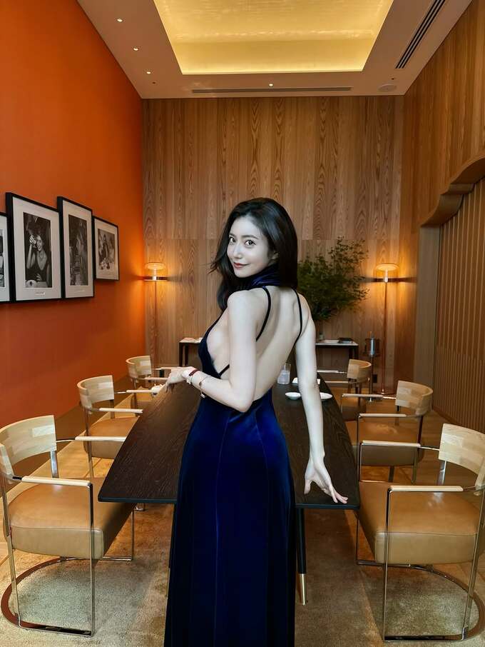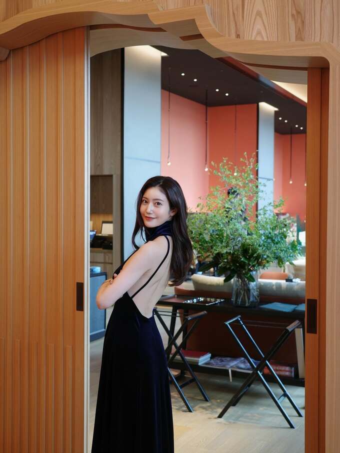 当日の装いは、ブルーのベロア素材のドレス。体のラインに沿った美しいシルエットに加え、背中が大きく開いたデザインが印象的です。このドレスについて阿部さんは「ベロア素材のブルーのドレスがかわいい」とコメントを添えています。