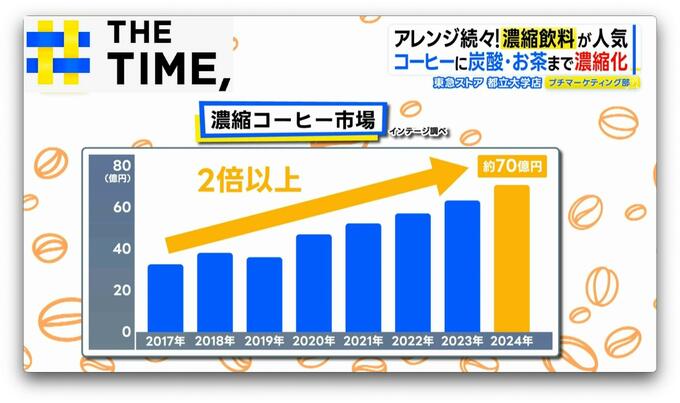 また、調査会社インテージによると「濃縮コーヒー市場」はここ8年で約2倍に。2024年は約70億円となり、様々なメーカーから商品が登場しています。