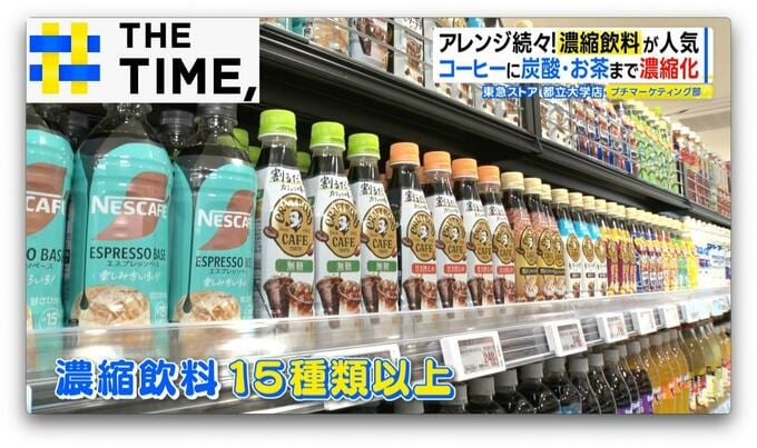 『東急ストア』グロサリー部の大山輝さんによると、濃縮タイプのコーヒー飲料の人気が高まるにつれ種類も徐々に増加。売り場面積も約1.5倍に広がっているといいます。