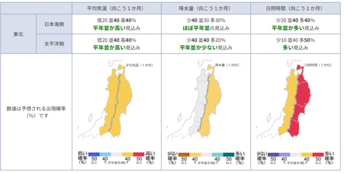 東北日本海側:平年並か高い見込み 東北太平洋側:平年並か高い見込み