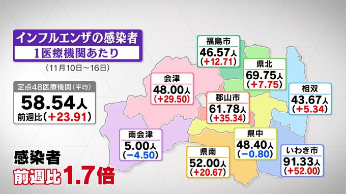 福島県内のインフルエンザについて、11月16日までの1週間に報告された感染者は、1医療機関あたり58人あまりと前の週よりもおよそ1.7倍に増えました。感染者が50人を超えるのは2019年以来です。