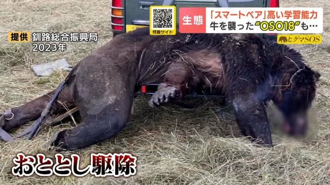 OSO18。道東の標茶町や厚岸町で66頭もの牛を襲い、肉を食べることを学習したクマです。