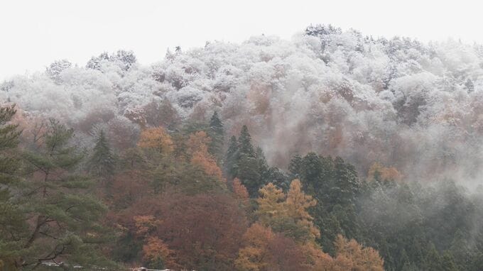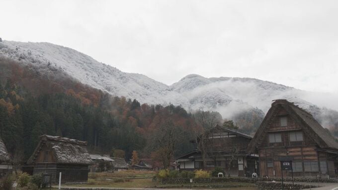 寒気の影響で、各地で冬の便りが届きました。合掌造りで知られる、世界遺産の白川郷では、きのうから雨や雪がふり、けさ、茅葺き屋根の上がうっすらと雪化粧。雪で真っ白になった山のふもとは、紅葉が見頃を迎え、秋と冬が入り混じる景色が広がっていました。
