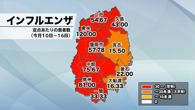 10日から16日までの1週間に報告のあった、県内の1定点医療機関あたりのインフルエンザ患者数の平均は55.9人となっています。
