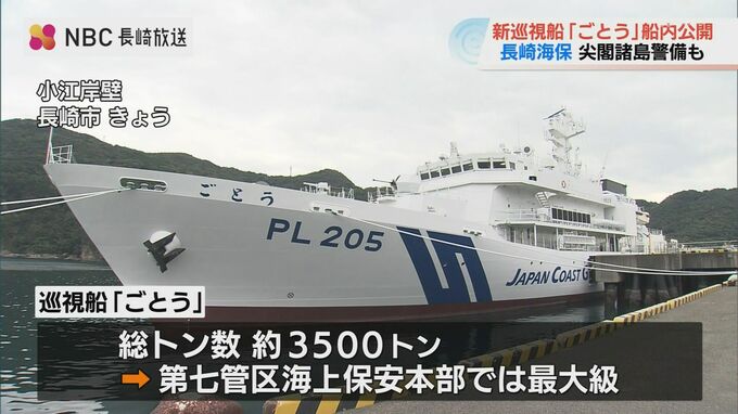 「ごとう」は総トン数およそ3500トンで、長崎海保を含む第七管区海上保安本部では最大級の巡視船です。海上の保安強化を目的に建造されていて、長崎県内海域での防災活動だけでなく尖閣諸島周辺の領海警備にもあたります。