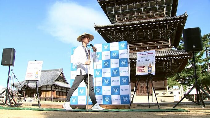 四国霊場第75番札所、善通寺にお遍路さんの姿で登場した、ケイン・コスギさんです。シニア世代のウォーキング習慣を応援する大正製薬のイベントの一環で訪れました。