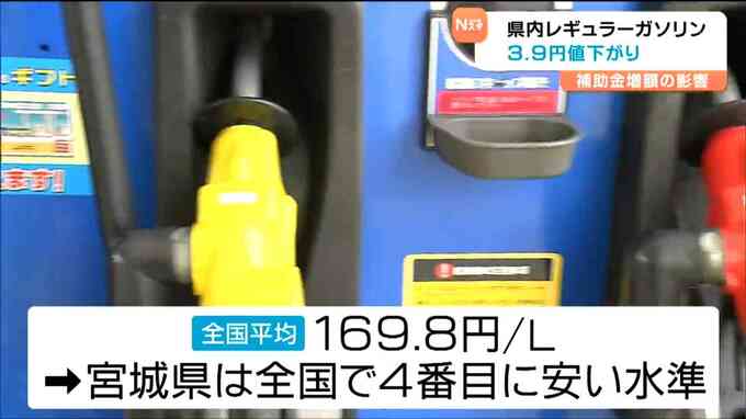 全国平均は前週に比べて3円70銭安い169円80銭で、宮城県は全国で4番目に安い水準となっています。