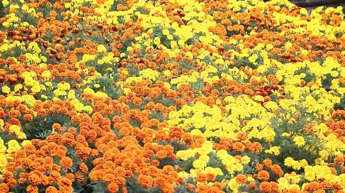 花壇一面に咲いたマリーゴールドもあわせて楽しめるレオマリゾートの「秋の大バラまつり」は11月24日まで開かれています。