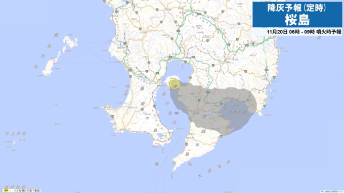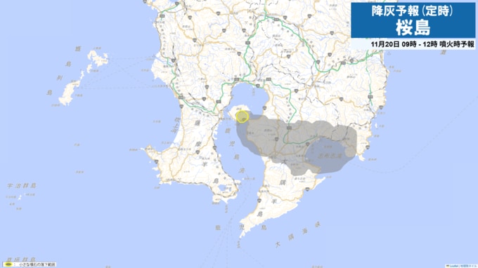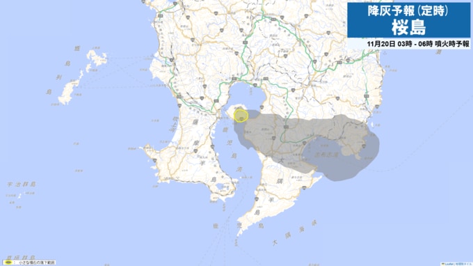 桜島降灰予報(定時)灰が予想されるエリアと時間帯