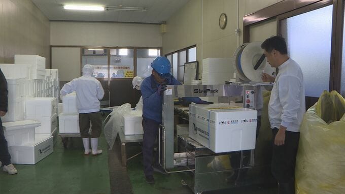 輸出されるのは毒のある内臓などを取り除いた「みがき」で、真空パックにして輸送用のボックスに詰められました。