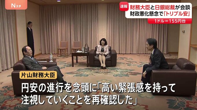 財政悪化への懸念から円安、株安、債券安の「トリプル安」が進むなか、日銀の植田総裁と片山財務大臣が会談を行い、「高い緊張感を持って市場の動向を注視する」ことを確認しました。片山さつき財務大臣「市場の動…