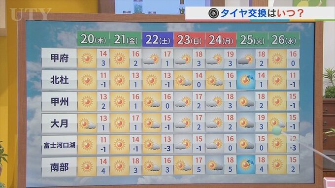 最低気温が3℃以下というのを見ていきますと、甲府、北杜市大泉、甲州市勝沼、大月、富士河口湖町も全部3℃以下となるんです。南部は5℃以上の日もありますが、この26日水曜日以降がどうなのか皆さん気にされる方が多いかもしれませんのできょうは16日先までお見せします。