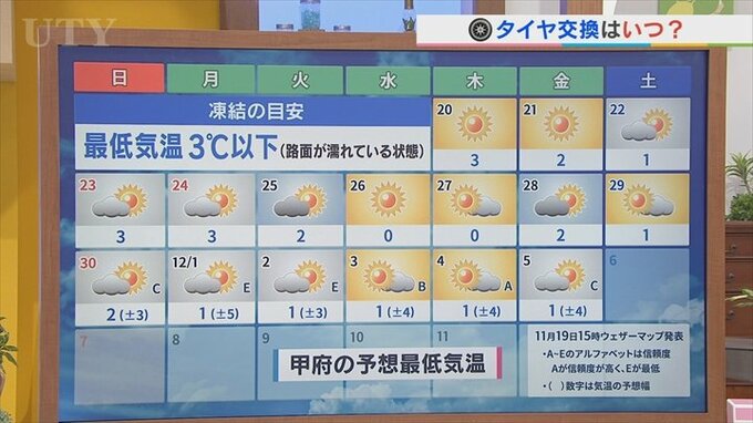 今のところずっと晴れマークがついている状況です。ですから気温だけ見るともういつ換えてもいい状況ですが、雨マークに変わると、翌日路面凍結の恐れがありますので、今後の天気予報をこまめに確認するようにしてください。