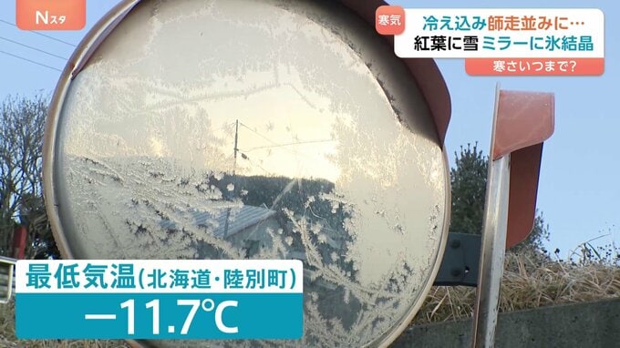 きょうは全国的に今シーズン一番の冷え込み、師走並みの冷え込みとなりました。紅葉に雪、ミラーに氷の結晶。この寒さいつまで続くのでしょうか?