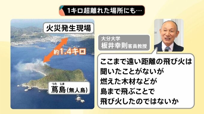 板井幸則さんは「ここまで遠い距離の飛び火は聞いたことがないが、燃えた木材が島まで飛ぶことで飛び火したのではないか」とみているということですね。