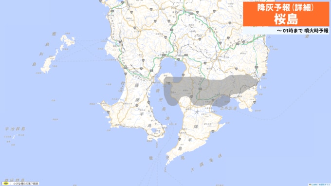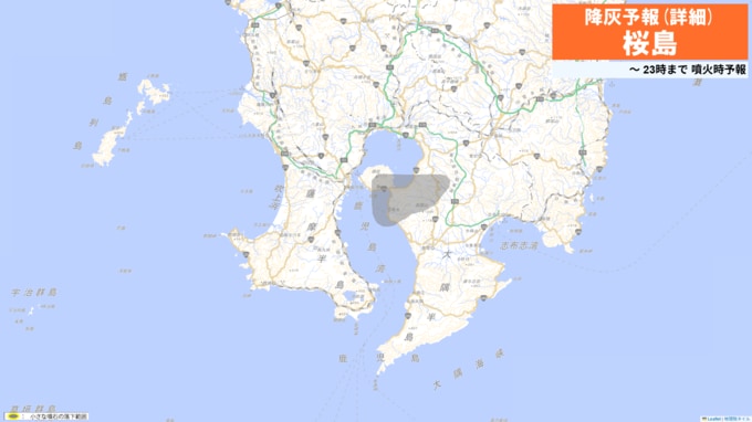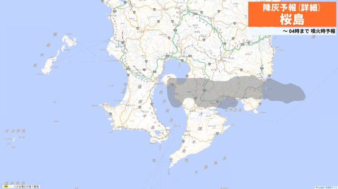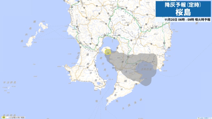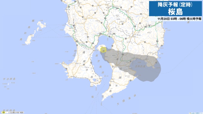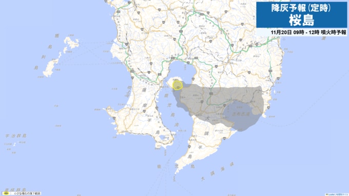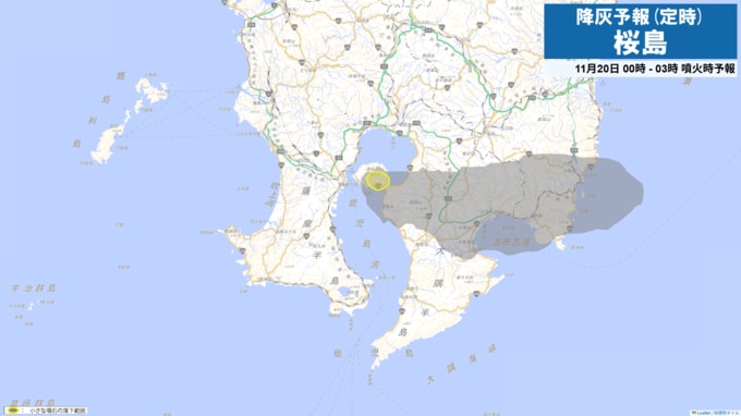 噴煙の高さが火口縁上2500mに達すると仮定した場合には、火口から東の鹿屋市輝北方向に火山灰が流され、20日午前4時までに桜島ではやや多量の降灰があり、降灰は宮崎県日南市まで予想されます。