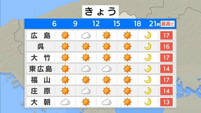 日中は、日差しがよく届き、ぬくもりも感じられそうです。最高気温は、広島・福山17℃、呉16℃、庄原14℃の予想です。きのうよりも2~3℃高いでしょう。空気が乾燥した状態が続いていますので、火の元、火の取り扱いには十分ご注意ください。