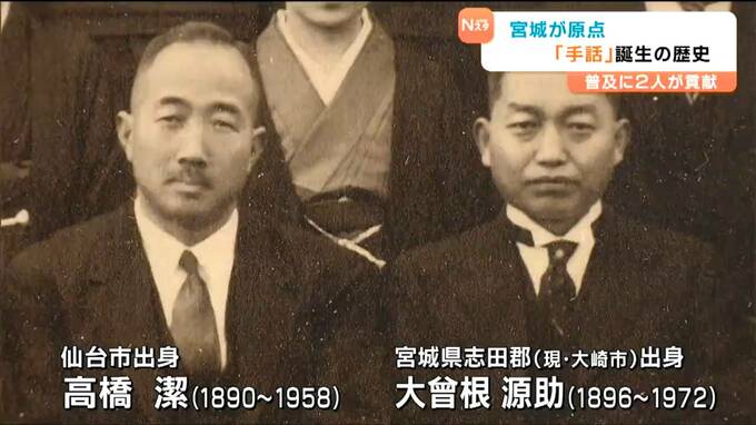 仙台市出身で「手話の父」とも呼ばれた高橋潔さんと大曾根源助さん。ともに東北学院で学んだあと、大阪市立聾啞学校に教員として就職し、日本の手話教育の普及に大きく貢献しました。