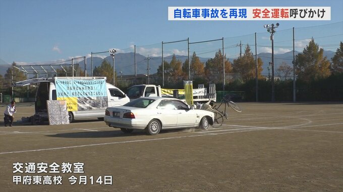 甲府東高校でスタントマンが自転車の交通事故を再現し安全運転を呼びかけました。