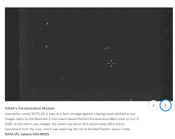 火星の地表にいる探査車「パーシビアランス」もその搭載カメラを使用し、2025年10月4日に「3I/ATLAS」のかすかな姿を捉えました。撮影時、「3I/ATLAS」は火星から約2,990万キロメートルの距離でした。