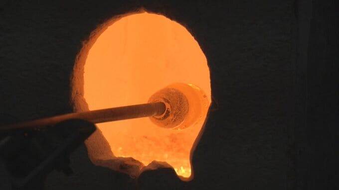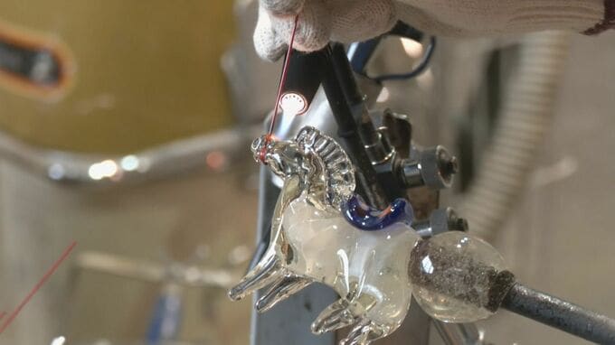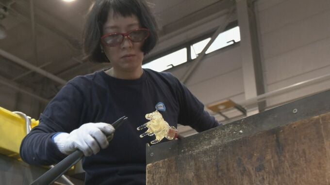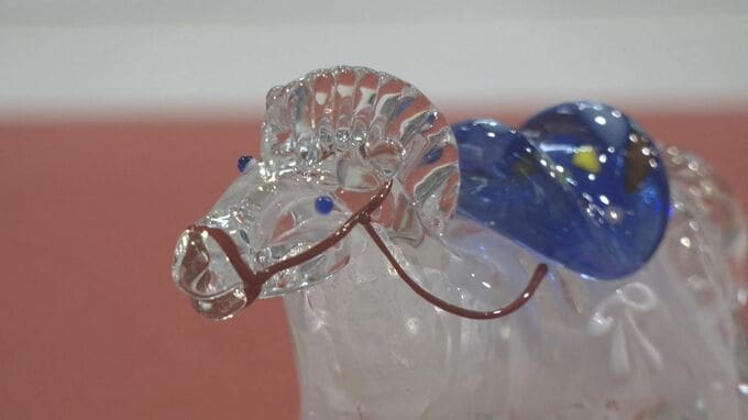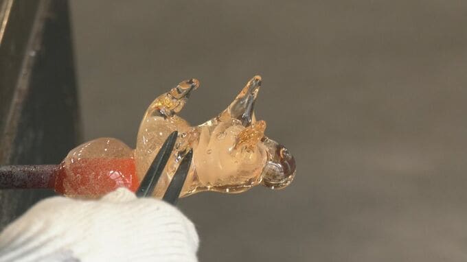 約1300度に熱せられたガラスが、職人の手により馬の脚に形作られていきます。岡崎市のリサイクル施設にある「岡崎ガラス工房 葵」では、廃棄されたガラス瓶を再利用した干支の置物作りが最盛期を迎えています。