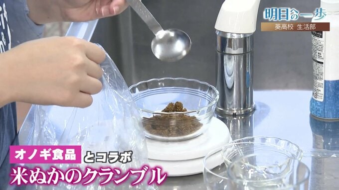 そしてもう1班。こちらの班は、オノギ食品と一緒に米ぬかを使ったクランブルを開発。これはすでに商品化決定まで進んでいるため、食べ方の提案として、パフェを試作しました。