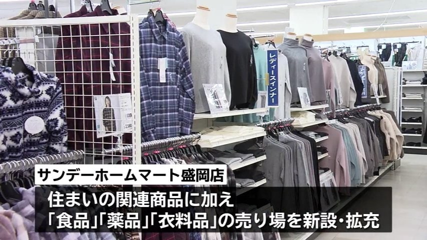 店内は従来の家電やDIY関連など住まいに関わる品々に加えて、野菜やパン、豆腐といった食品、薬品や衣料品などの売り場を新設したり拡充したりしました。