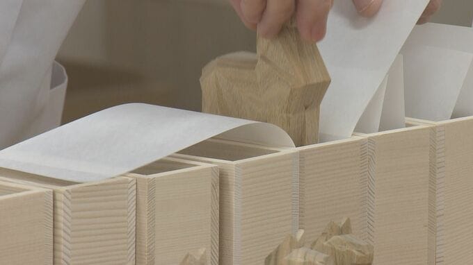 箱詰め作業は伊勢神宮の正月を迎える準備の一つで、きょうは完成した「干支守」に傷がないか職人が入念に確かめながら、神宮林のもみの木から出来た白木の箱に、ひとつずつ丁寧に収めていきました。