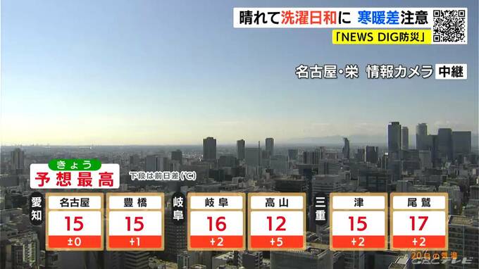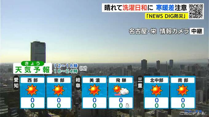 きょうは午後も晴れるでしょう。空気がカラッとして、厚手の洗濯物もよく乾きそうです。愛知県や岐阜県を中心に空気が乾燥しやすくなるため、火の取り扱いにはご注意ください。