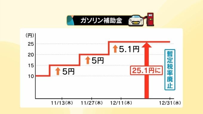 これまで10円だった補助金は、11月13日に5円増額され、さらに2週間後の11月27日に5円、12月11日には5.1円増額され、補助金の額が暫定税率分の25.1円と同じ水準となります。