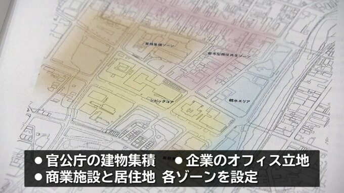 基本方針案は市民から寄せられた意見などを基に、50年後のまちを想定した土地利用を行うため、これまで通り官公庁の建物が集積するゾーンに加えて、企業のオフィスが立地するゾーン、商業施設と居住地の広がるゾーンを設定しています。