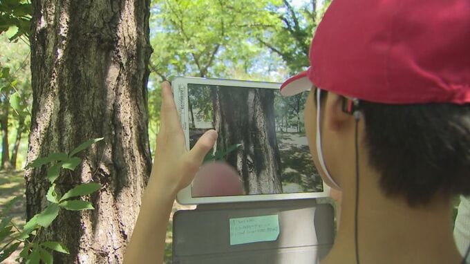 雨上がりの屋外で子供たちは色んな生き物を見つけ、シャッターを切ります。