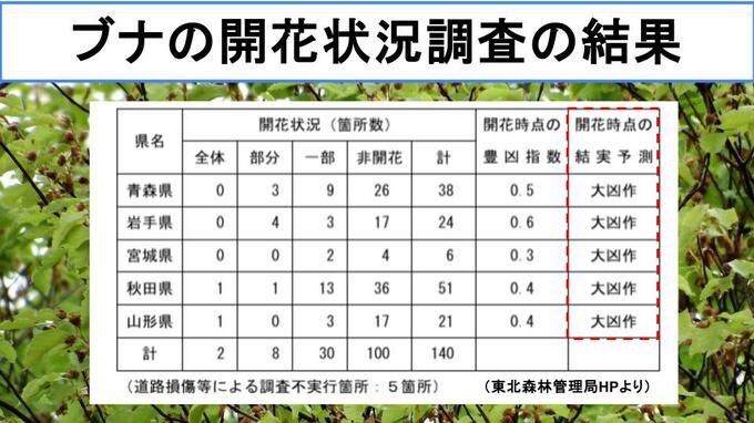 ライバルが増える中、エサ不足のもう一つの大きな要因はドングリ(特にブナの実)の不足です。林野庁によると東北5県ではブナの開花状況が軒並み「大凶作」となっていました。