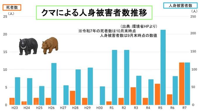 今年のクマによる人身被害は、過去に例を見ないペースで増加しており、死者数は10月末時点で去年の4倍、人身被害者数も過去最多を記録した2023年と同水準となっています。出没件数は2万792件で、過去一番多かった2023年度を大きく上回るペースとなっています。