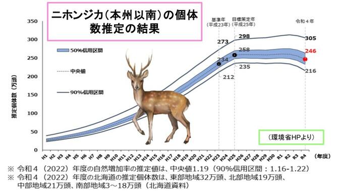 クマと同じように森に生息し、同じようにエサを食べるシカの推定個体数は約246万頭(中央値)です。ヒグマは約1万2000頭、ツキノワグマは約4万2000頭以上といわれているので、シカの個体数の多さがわかります。