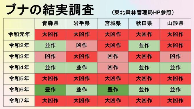 ブナの「大凶作」は数年間実をつけない「凶作」(一般的に5~7年)で動物の個体数を抑え、蓄えたエネルギーで突然大量に実をつける「豊作」を迎えるという、ブナ独自の生存戦略「マスティング」によるものです。