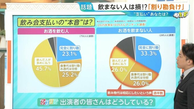 飲む側も「飲んだ人が多めに支払うべきだ」と思う人が多く、飲まない側も「飲み物代は相応にしたい」という人が過半数を超えていることが分かります。