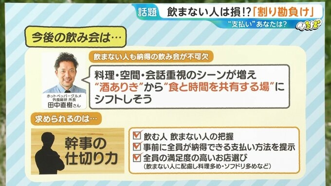 ホットペッパーグルメ 外食総研所長の田中直樹氏によると、今後は「飲まない人も納得の飲み会」が不可欠。